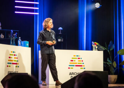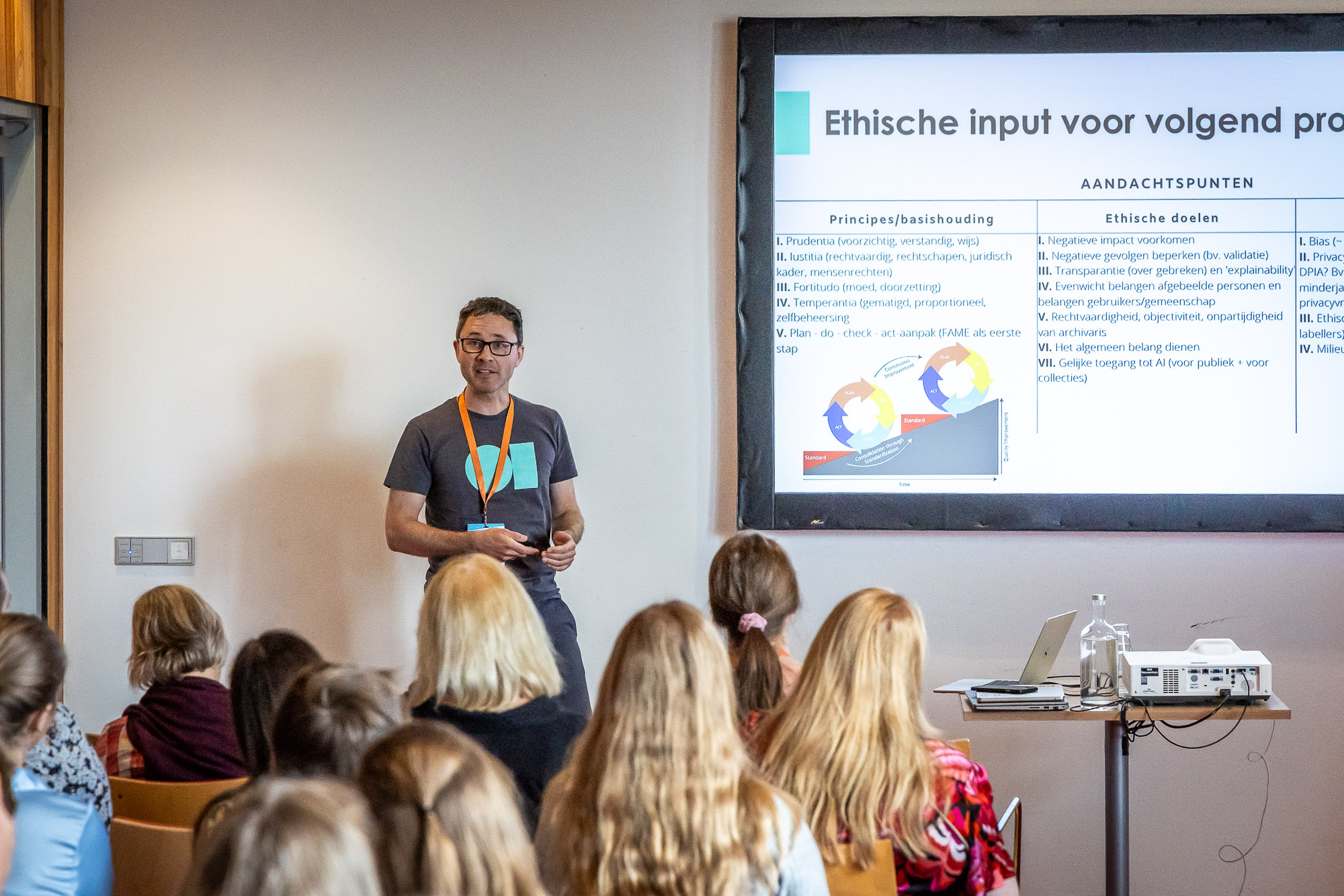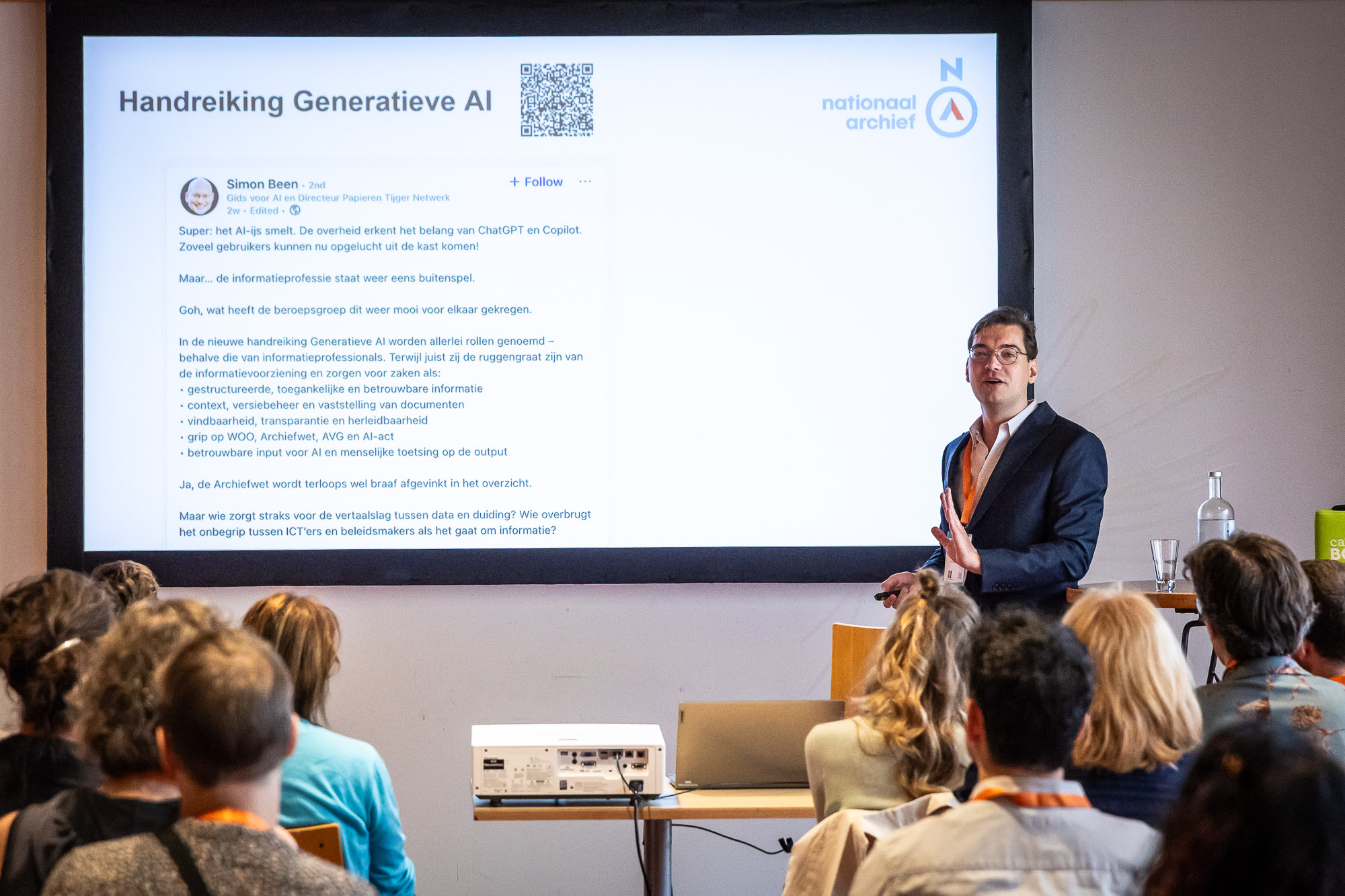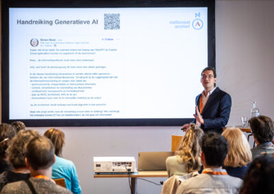 Tijdens Archiefdag 2025 boden wij een aansprekend programma. Naast de twee rondes met verdiepingssessies hebben we een boeiend plenair programma. Met een talkshow onder leiding van dagvoorzitter Sheila Sitalsing. De gasten waren Afelonne Doek, Niels Hansen, Sofie Taes en Iris Muis. En als prikkelende afsluiter sprak toekomst-historicus Aragorn Meulendijks over The Coming Wave. Hij deelde zijn inzichten die geworteld zijn in een diepgaande studie van de geschiedenis en trendanalyse. In plaats van alleen te focussen op de nieuwste ontwikkelingen. Aragorn Meulendijks pleit ervoor dat niets doen geen optie is. Individuen, instellingen en bedrijven moeten vandaag beginnen met zich voor te bereiden op de disruptieve tsunami van technologische verandering. Die nadert snel en zal ook voor de archiefsector vergaande impact hebben.